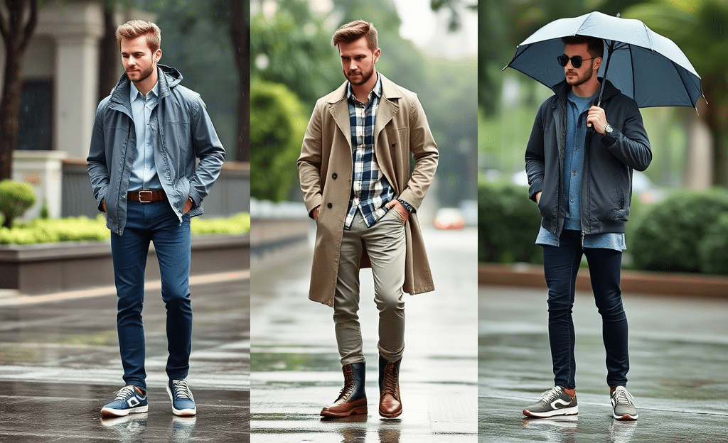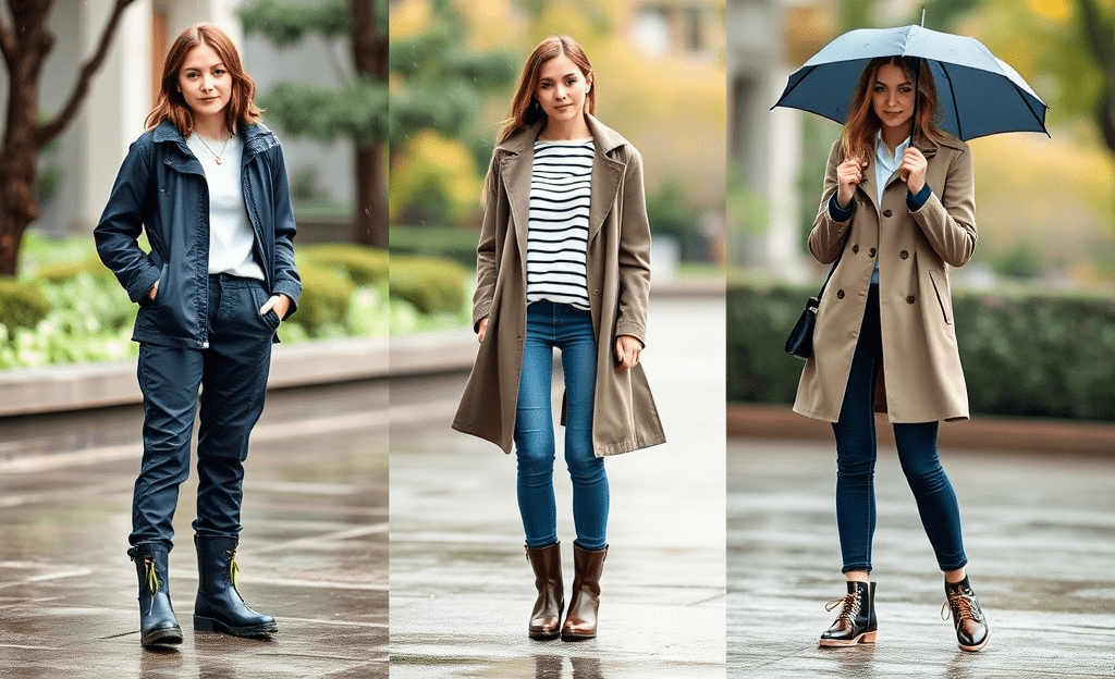 *Casual raincoat, dark jeans, waterproof sneakers, and an umbrella for practical fashion.
