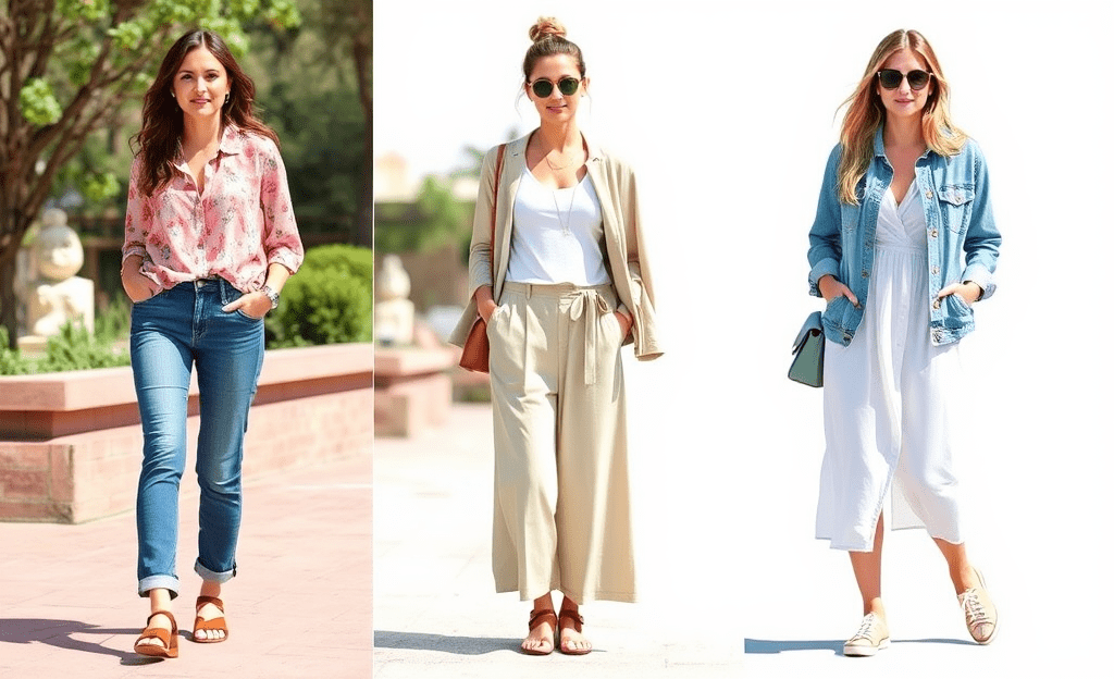 *Casual T-shirt or tank top with wide-leg pants or a skirt, adding a light jacket for breeze protection.