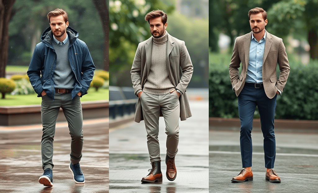 *Men in waterproof jacket, long-sleeve shirt, comfortable pants, and waterproof sneakers for rainy weather.