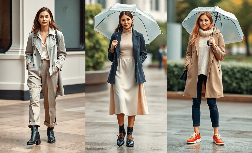 *Light trench coat, long-sleeve blouse, relaxed trousers, and waterproof ankle boots.