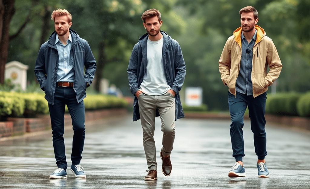 *Light waterproof jacket, breathable shirt, slim-fit jeans, waterproof sneakers for rainy comfort.