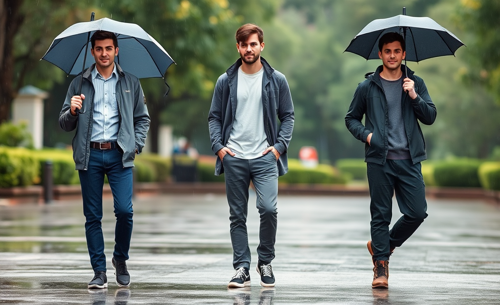 *Slim-fit raincoat, breathable long-sleeve tee, waterproof sneakers, chinos, compact umbrella