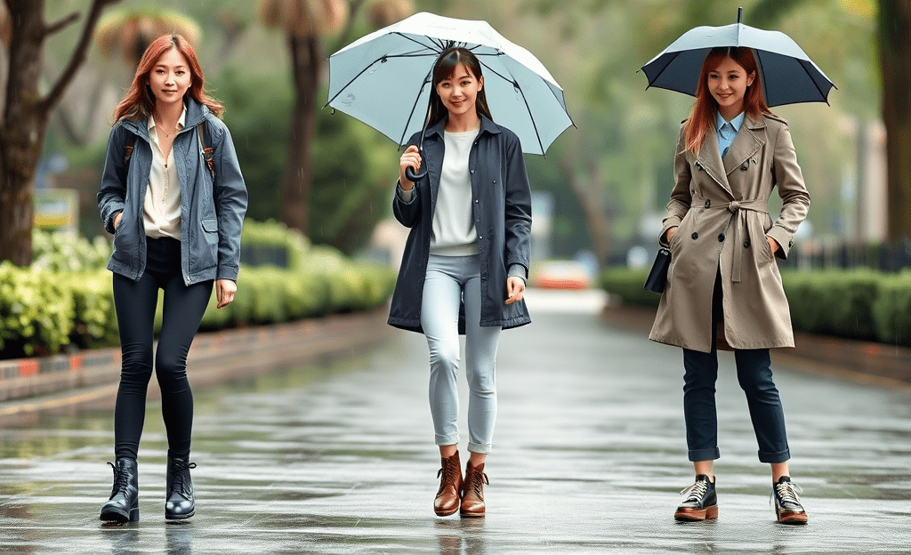*Water-resistant trench coat, long-sleeve top, waterproof shoes, comfortable trousers, umbrella