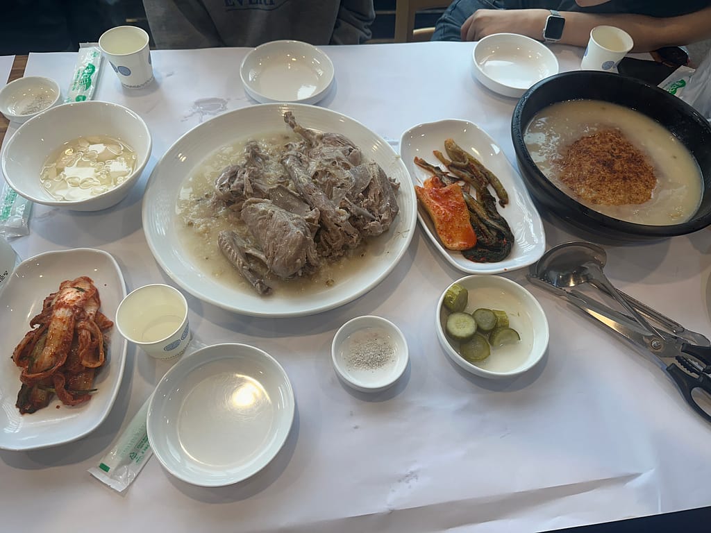 백숙은 넓은 접시에 국물은 자작하게, 속에는 찹쌀·녹두·대추·마늘이 들어 향이 고소합니다. 살은 퍽퍽살과 촉촉살이 반반 느낌. 소금에 콕 찍어 먹으면 담백해요. 핵심은 누룽지 죽인데, 따로 바삭하게 구워 나와 섞기 전 한입은 바삭함을, 섞은 뒤엔 고소한 농도를 즐길 수 있어요. 마늘 향이 도드라져 얼큰한 김치와 궁합이 좋았습니다. 기본찬은 겉절이, 파김치, 동치미가 깔끔했고, 셀프바에서 추가 가능. 막국수는 새콤달콤 간이 세지 않아 백숙 사이사이 입맛 환기에 딱이었어요. 아래 사진으로 구성과 맛을 전해요. 외관-내부-그 외 사진 순서로 배치했습니다.