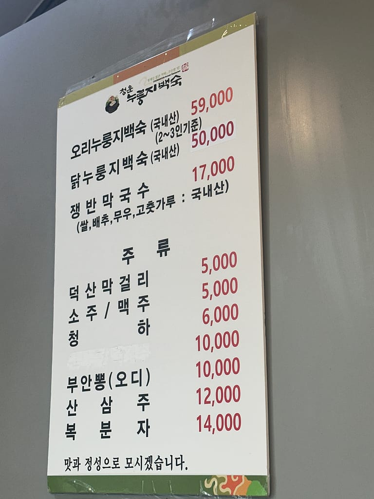 메뉴는 닭 누룽지백숙, 오리 누룽지백숙, 쟁반막국수 등으로 심플해요. 가격 표기는 닭 50,000원, 오리 59,000원, 쟁반막국수 17,000원 기준이었고 변동될 수 있다고 하네요. 고민하다가 기름기 적당한 닭 누룽지백숙과 막국수를 주문했습니다. 주차, 위치, 가격, 메뉴, 맛을 빠르게 비교하면 가성비는 2~3인 기준 충분. 메뉴판은 아래 사진 참고해 주세요.