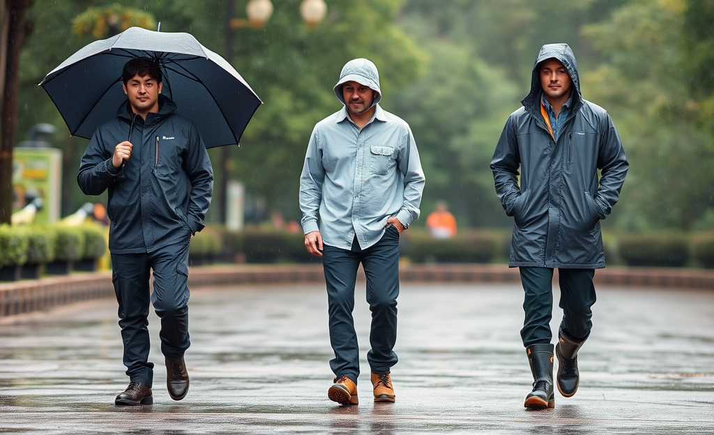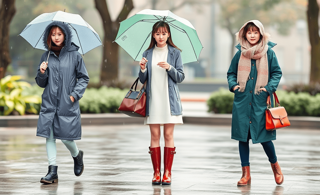 “비 오는 날에는 방수 재킷과 우산이 필수입니다. 레인코트와 방수 신발, 긴 소매 옷으로 체온을 유지하세요. 방수 가방이나 우비를 더하면 더욱 편리하며, 우산으로 비를 피하세요.”