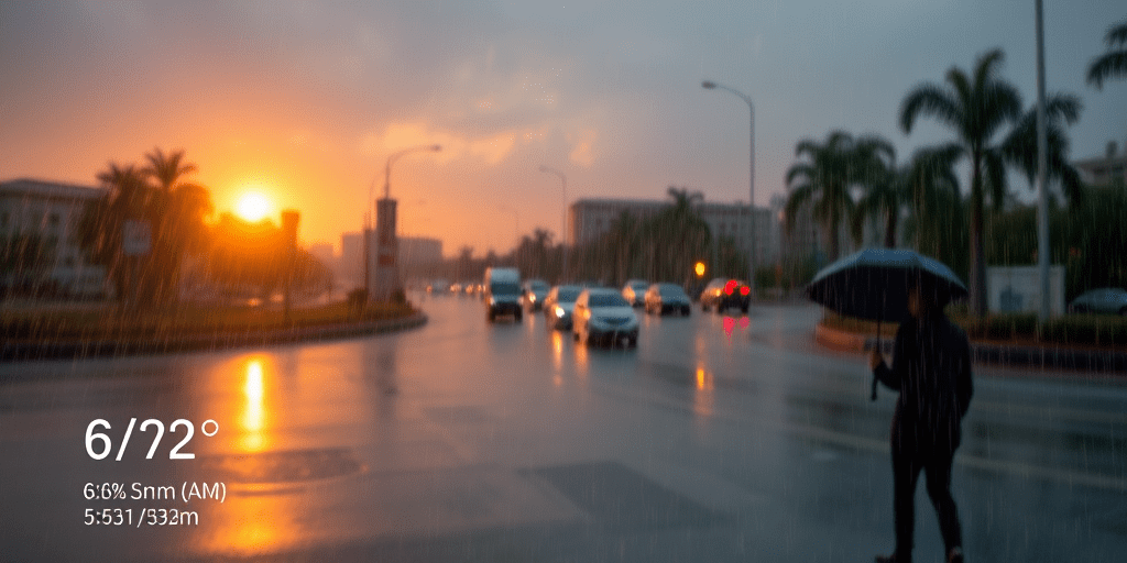“오늘은 강한 비가 내리고 있으며, 바람이 초속 5m로 부는 날씨입니다. 습도는 62%로 다소 습한 편이며, 오전 6시 42분에 해가 뜨고 오후 5시 51분에 해가 집니다. 외출 시 우산과 방수 옷을 챙기세요.”