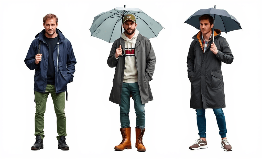 *Waterproof trench coat, long-sleeve top, rain boots, accessorized with a stylish umbrella.