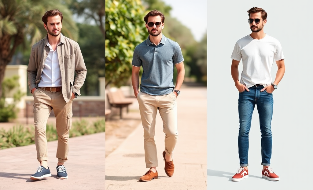 *Casual polo shirt with beige trousers and loafers, perfect for a sunny day outdoors.