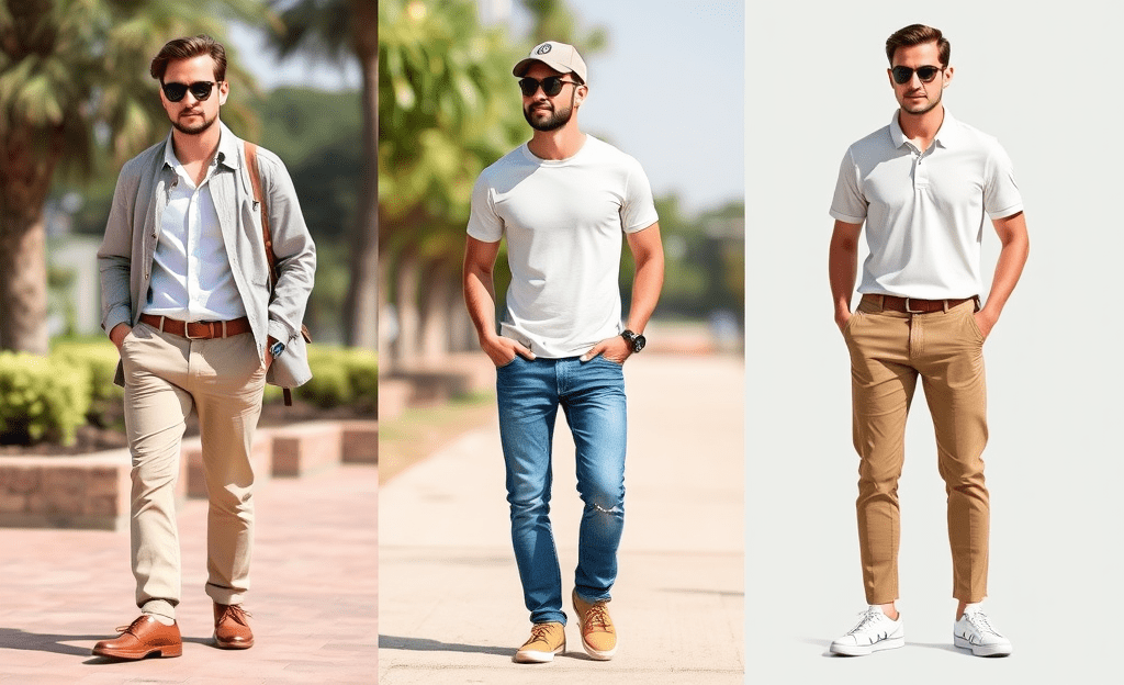 *Light long-sleeve shirt with chinos, sunglasses, and a light jacket for a fresh, casual look.
