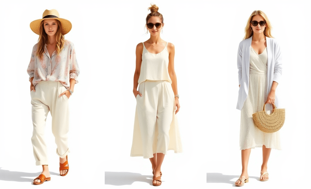 *Flowy blouse with linen trousers and a wide-brim hat for a breezy, chic outfit.