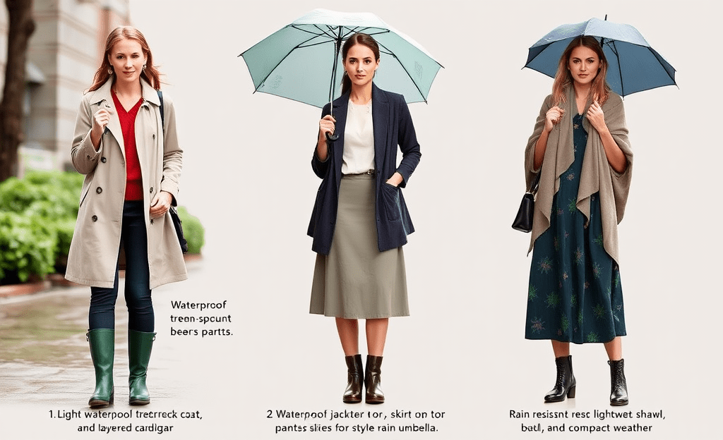 *Rain-resistant dress with a lightweight waterproof shawl, ankle boots, and a compact umbrella for rainy weather.