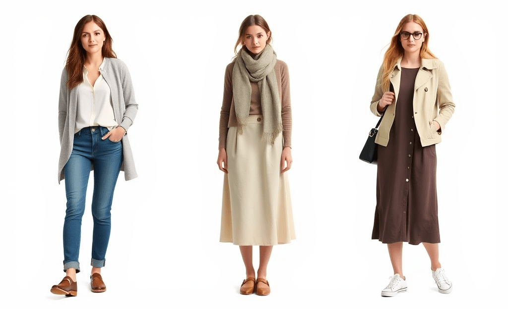 *Long-sleeve top layered with a scarf, skirt, and flats for versatile style.