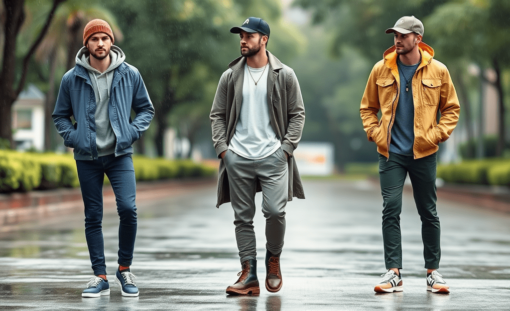 *Light waterproof jacket, thin hoodie, slim-fit jeans, waterproof sneakers, beanie for rain protection.
