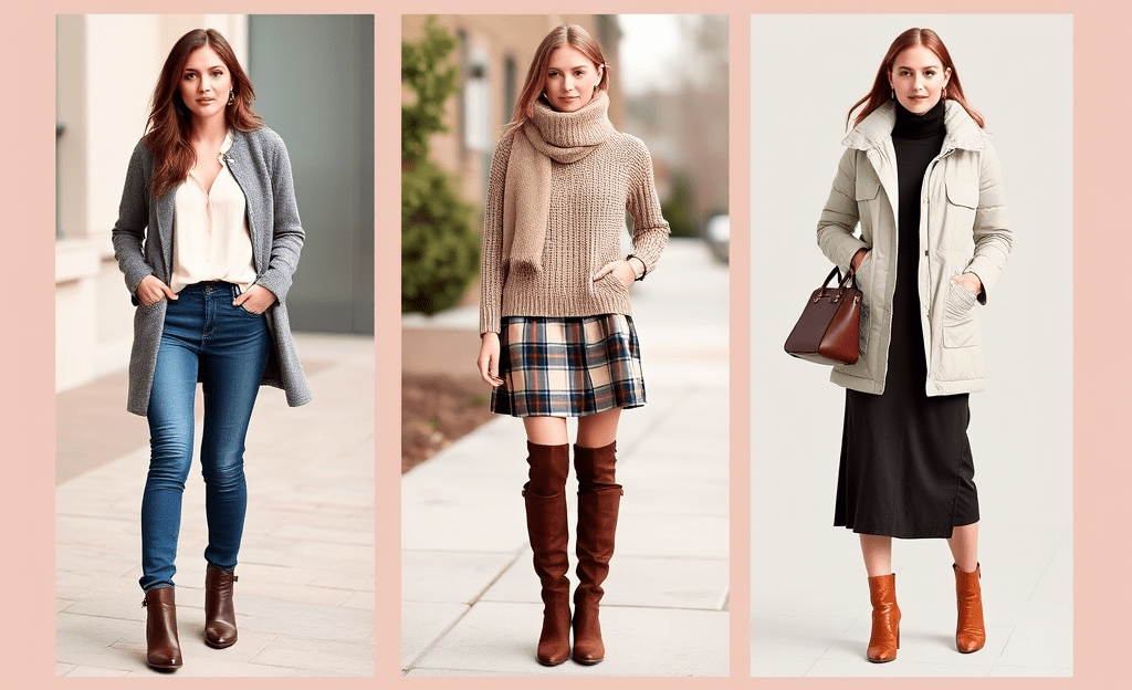 *Knit sweater with a plaid skirt and knee-high boots, accessorized with a cozy scarf.